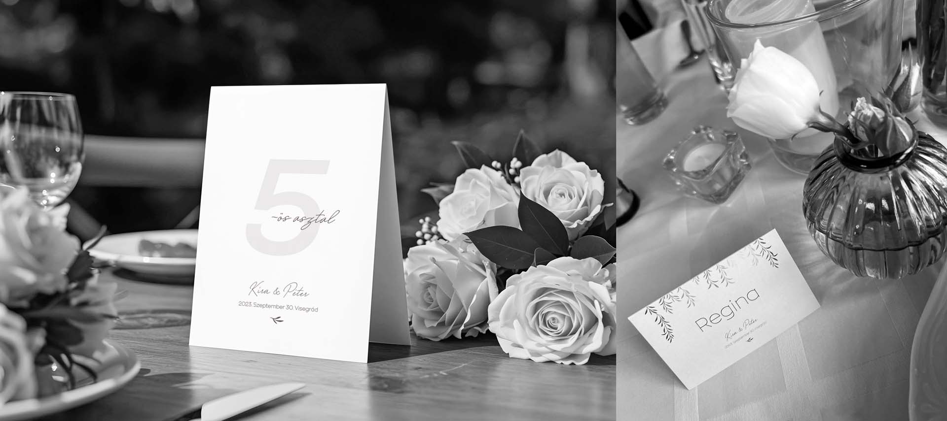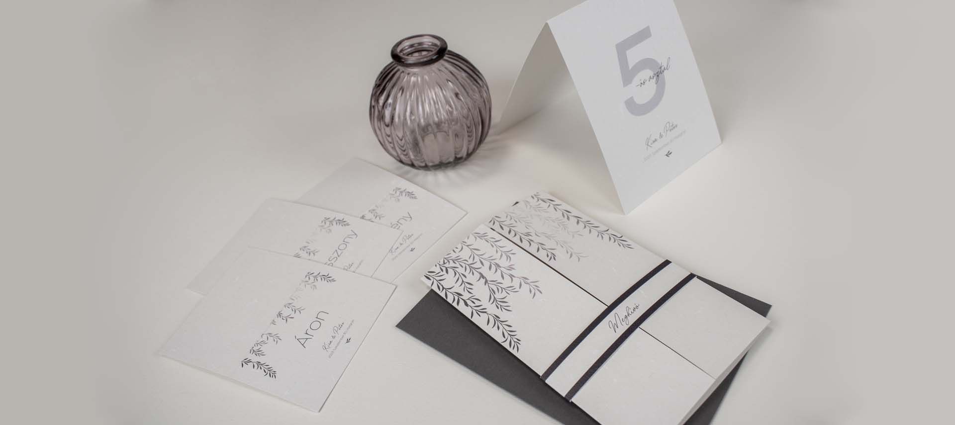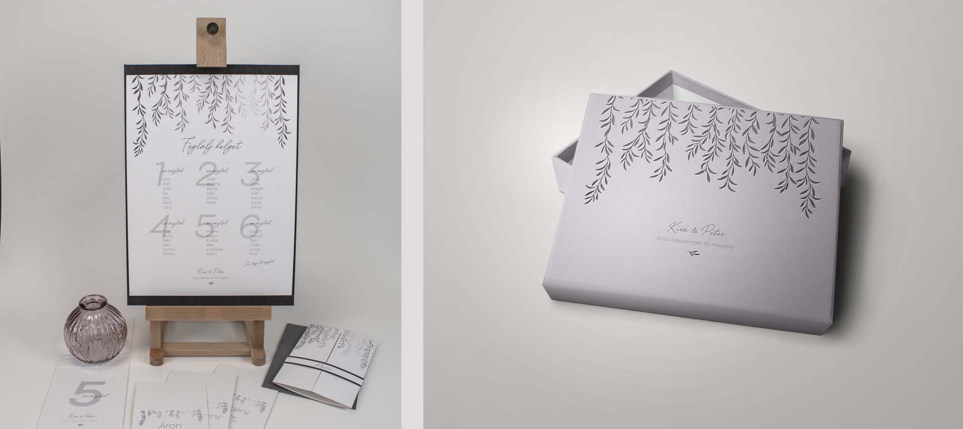 A természet ihlette grafikai elemek letisztultságot és harmóniát sugároznak, míg a lila szín a megrendelő személyes kívánságát valósítja meg. Az egyedi tervezésű darabok nemcsak esztétikai élményt nyújtanak, hanem a kapcsolat mélységét és egyediségét is kifejezik.